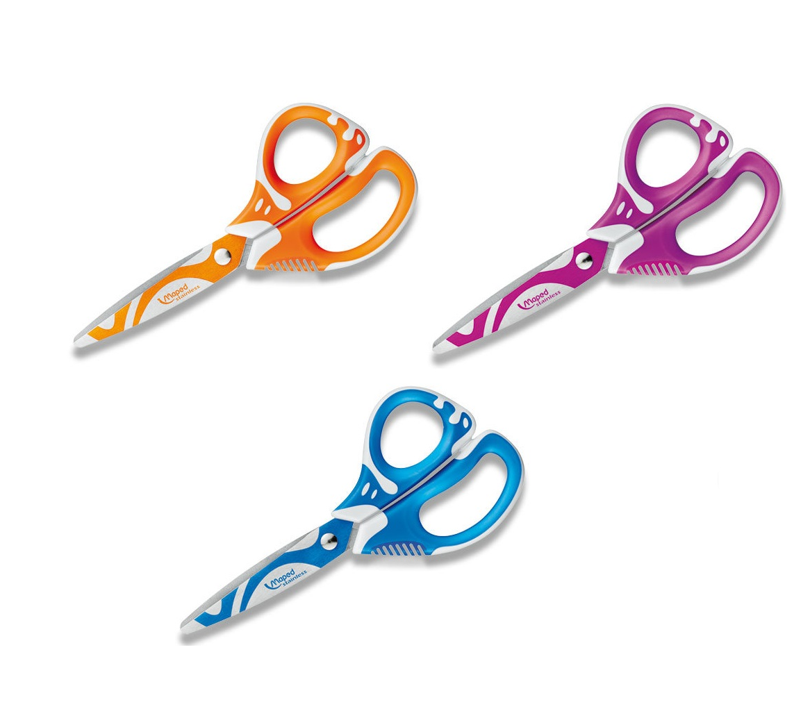 Maped scissors Zenoah fit with round tip for righties Assorted colors: orange, blue and pink on blister. 13 cm, asymmetric eyes