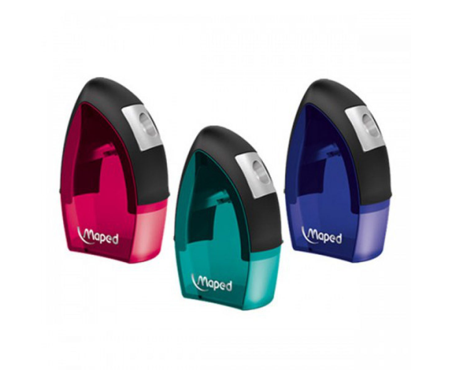 Metal sharpener with transparent tray. Assorted transparent colors: pink, green and blue.