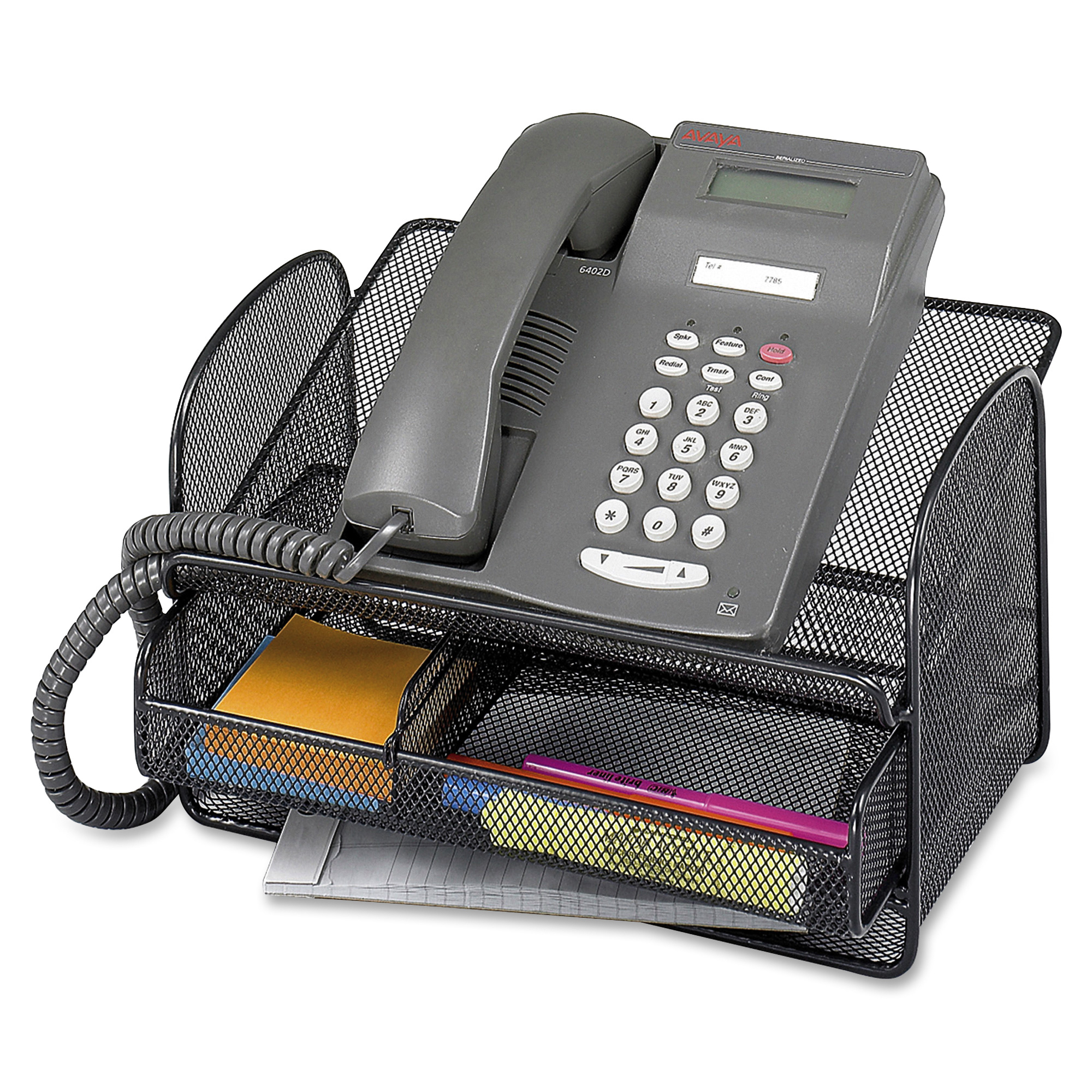 Angled platform holds phone at just the right degree for quick and easy dialing and pickup. Versatile storage drawer has adjustable, removable divider. Additional storage underneath stand can be used for phone books, notebooks, files, binders or papers. Steel mesh design with durable, black powder coat finish.