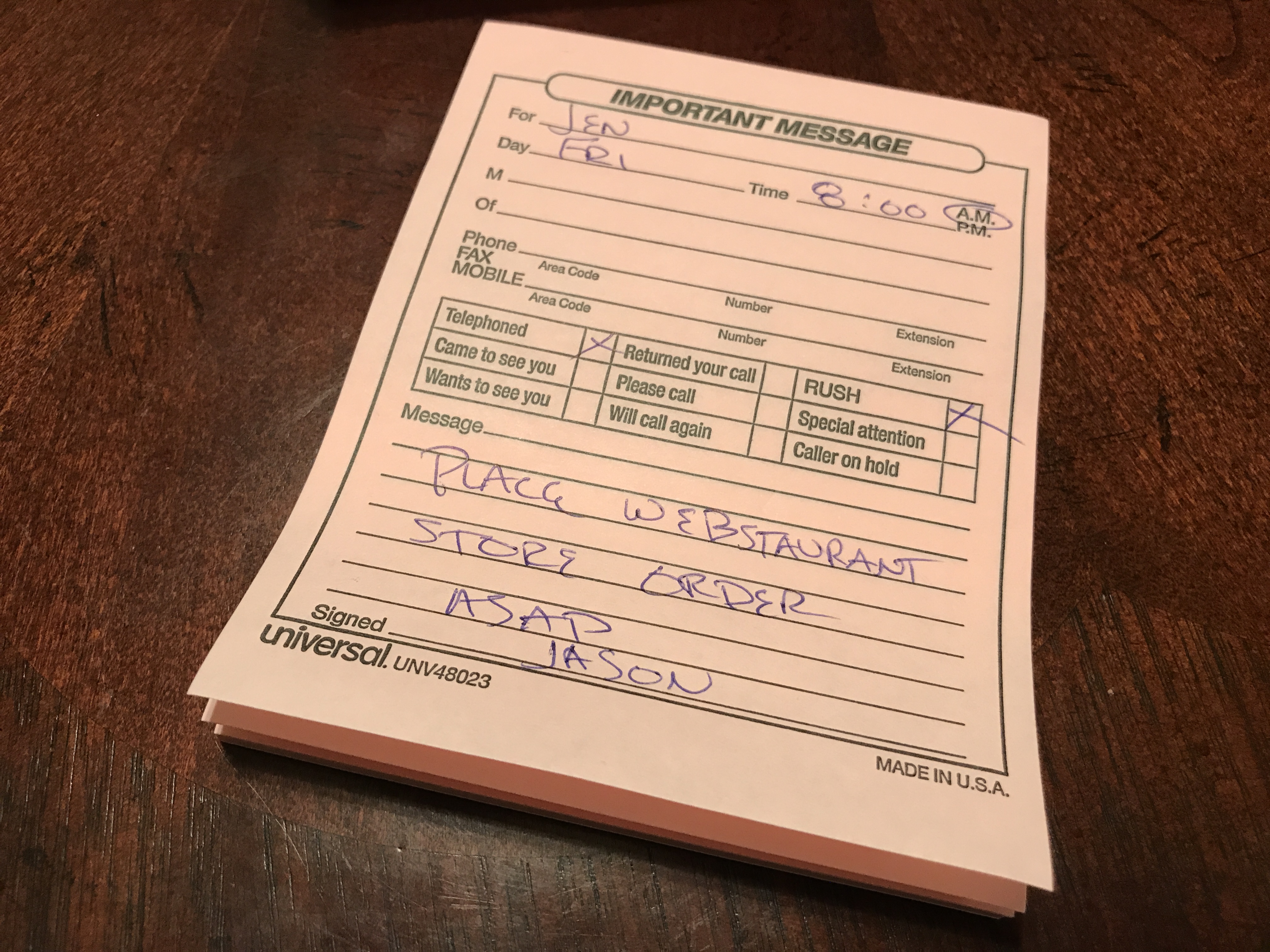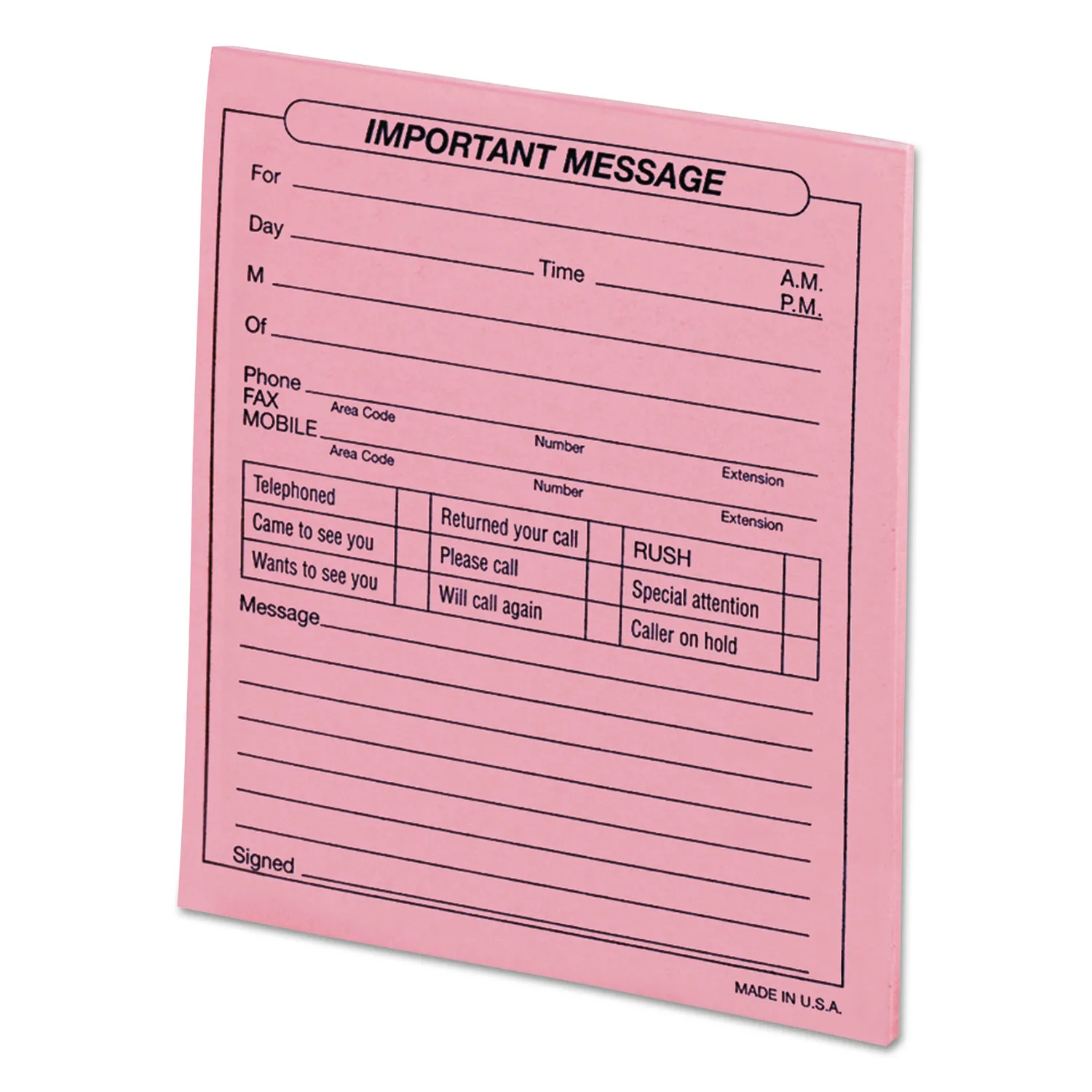 This hard-to-miss paper includes a large "Important Message" header. Plus, its pink color stands out amongst standard office paper. It includes ample room for a message, as well as important details including the date, time, and contact information.