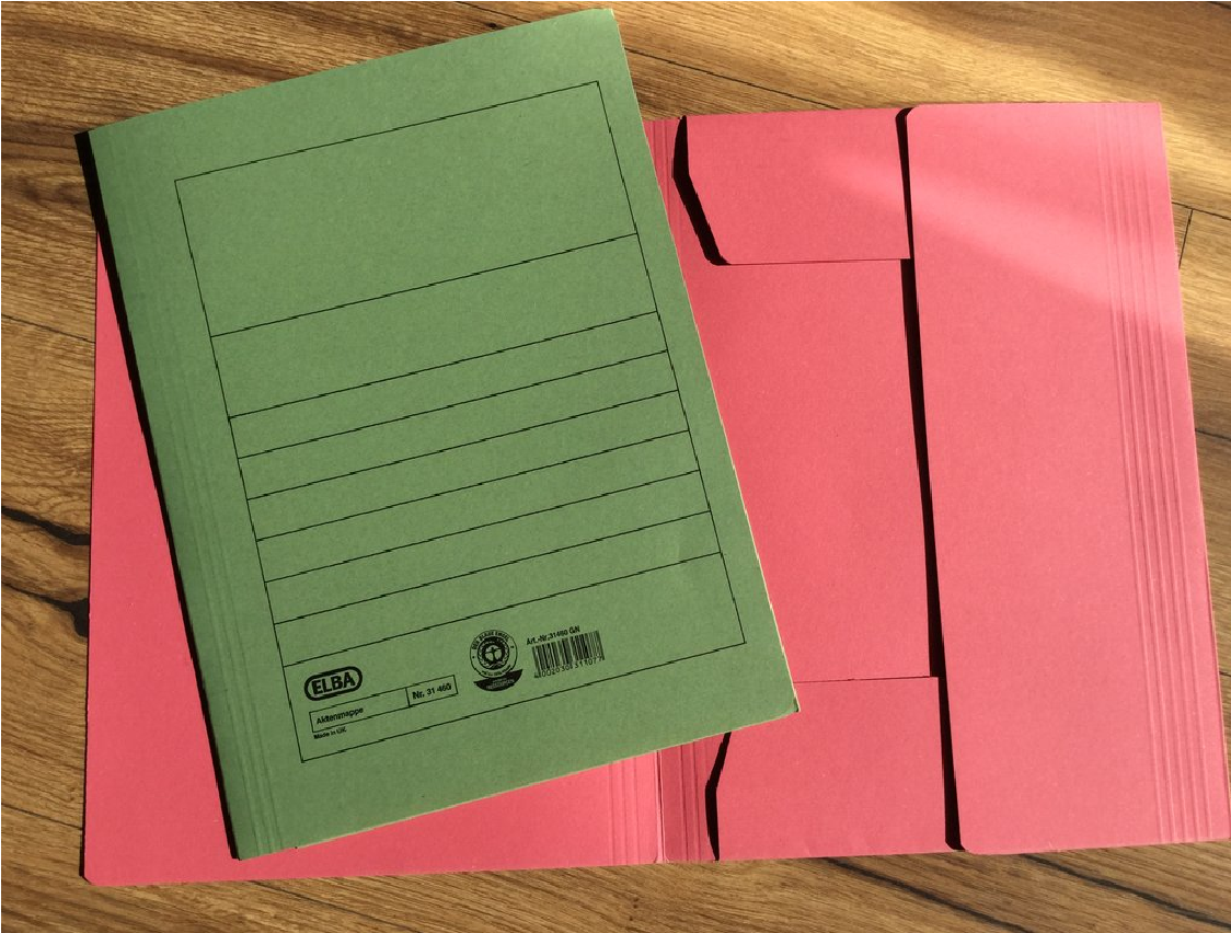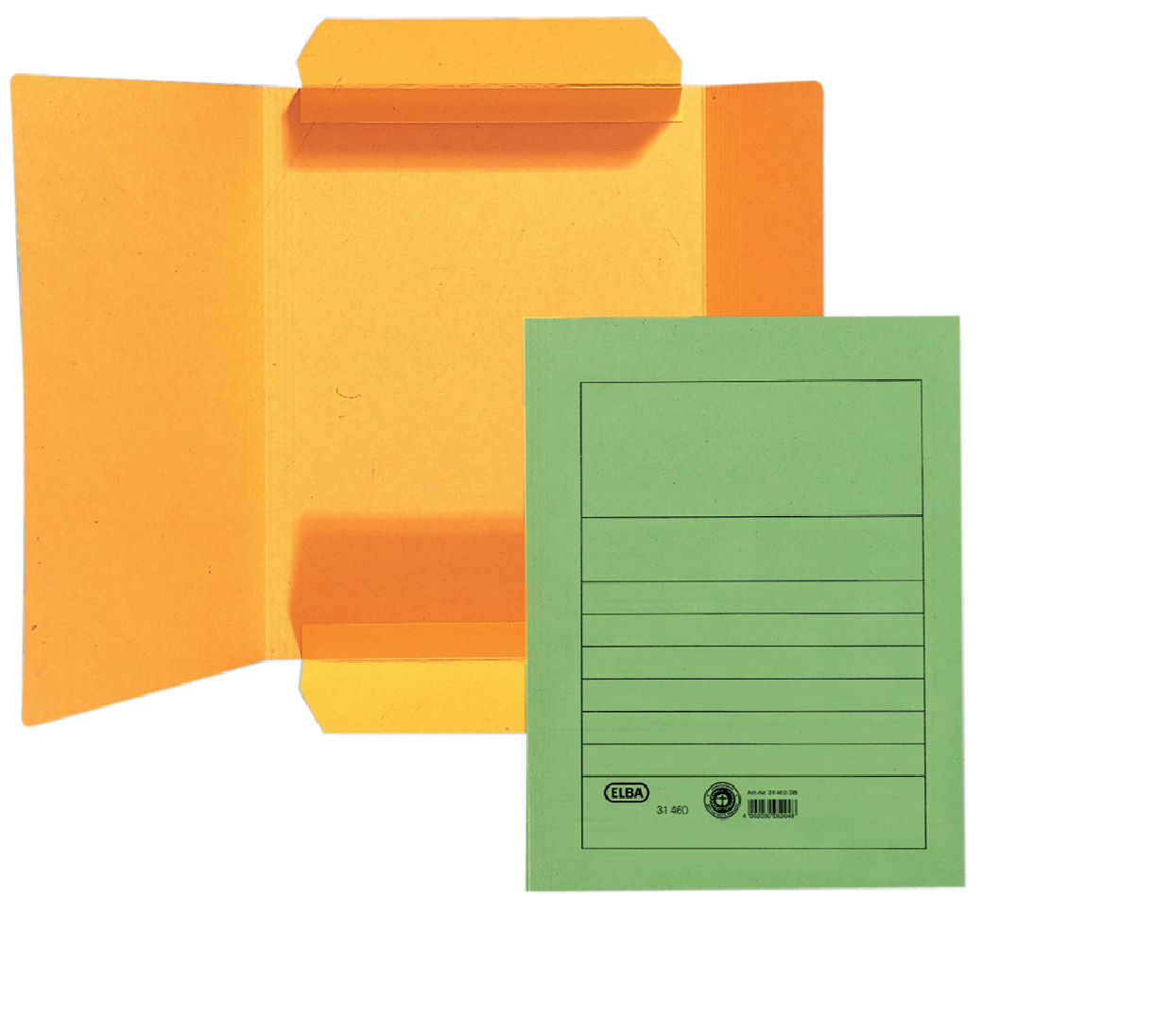 Fixed cardboard lid with imprint. For about 150 A4 sheets. Back cover with three hinged flaps. Made of manila cardboard (RC), 250 grams per m2. For A4.