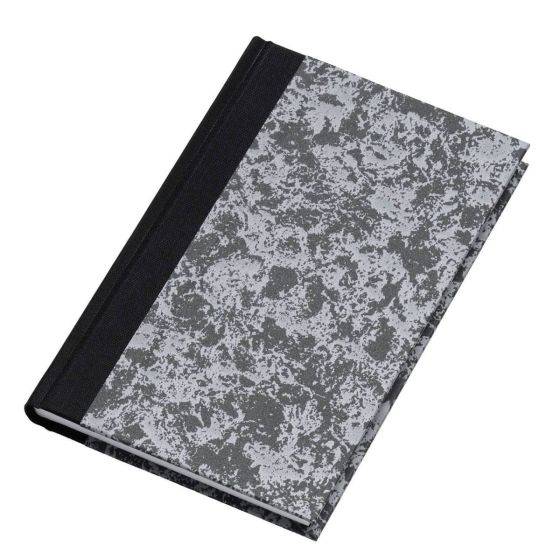 Sewed binding, black linen spine back, plastic grey marbled front and back cover.