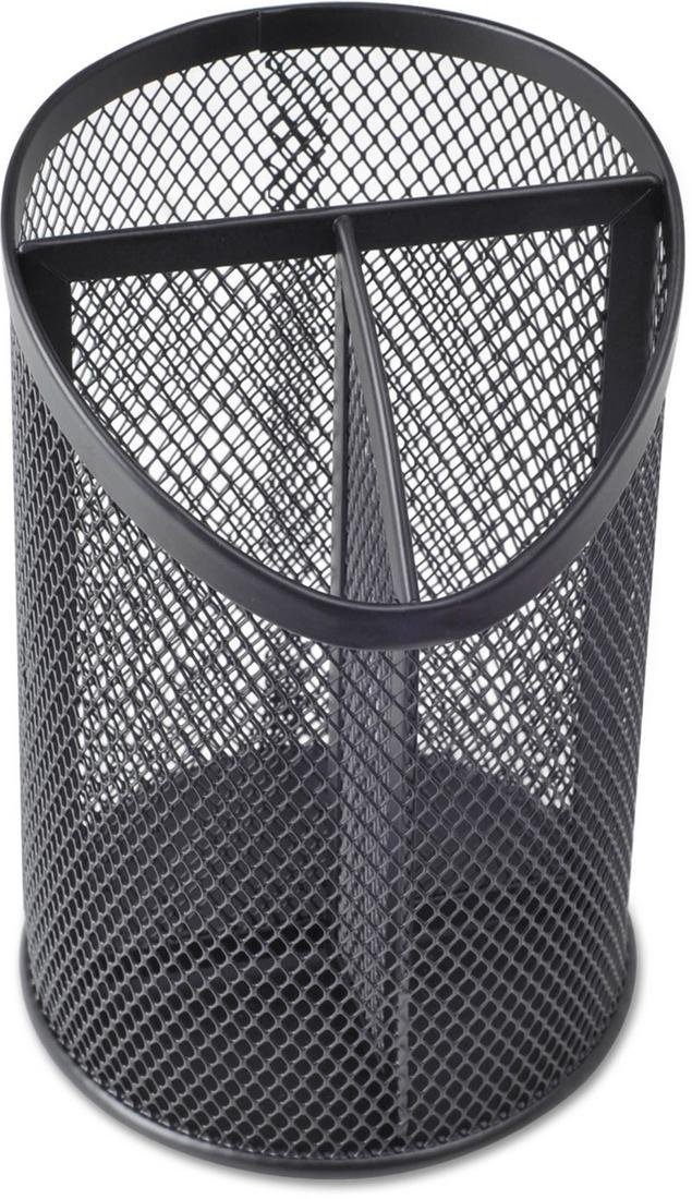 - Three compartments to sort your writing instruments, rulers, scissors and office supplies. Angled opening to conveniently access both short and tall supplies. Durable metal mesh construction is both strong and stable to withstand years of use. Pencil Cup Type: 3-Section Pencil Cup; Color(s): Black; Material(s): Metal; Diameter: 4 1/8".