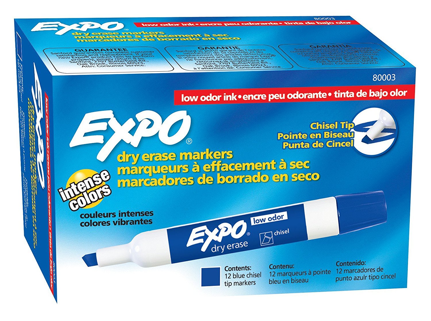 - Bright, vivid, non-toxic ink is quick-drying, smear-proof, easy to see from a distance, and provides consistent color quality. Whiteboard markers with versatile chisel tips allow for broad or fine writing. Erases cleanly and easily with a dry cloth or Expo eraser. Ink is specially formulated to be low-odor. Perfect for use in classrooms, small offices, and homes. Expo 2 Low-Odor Dry Erase Markers, Chisel Tip, 12-Pack, Blue.