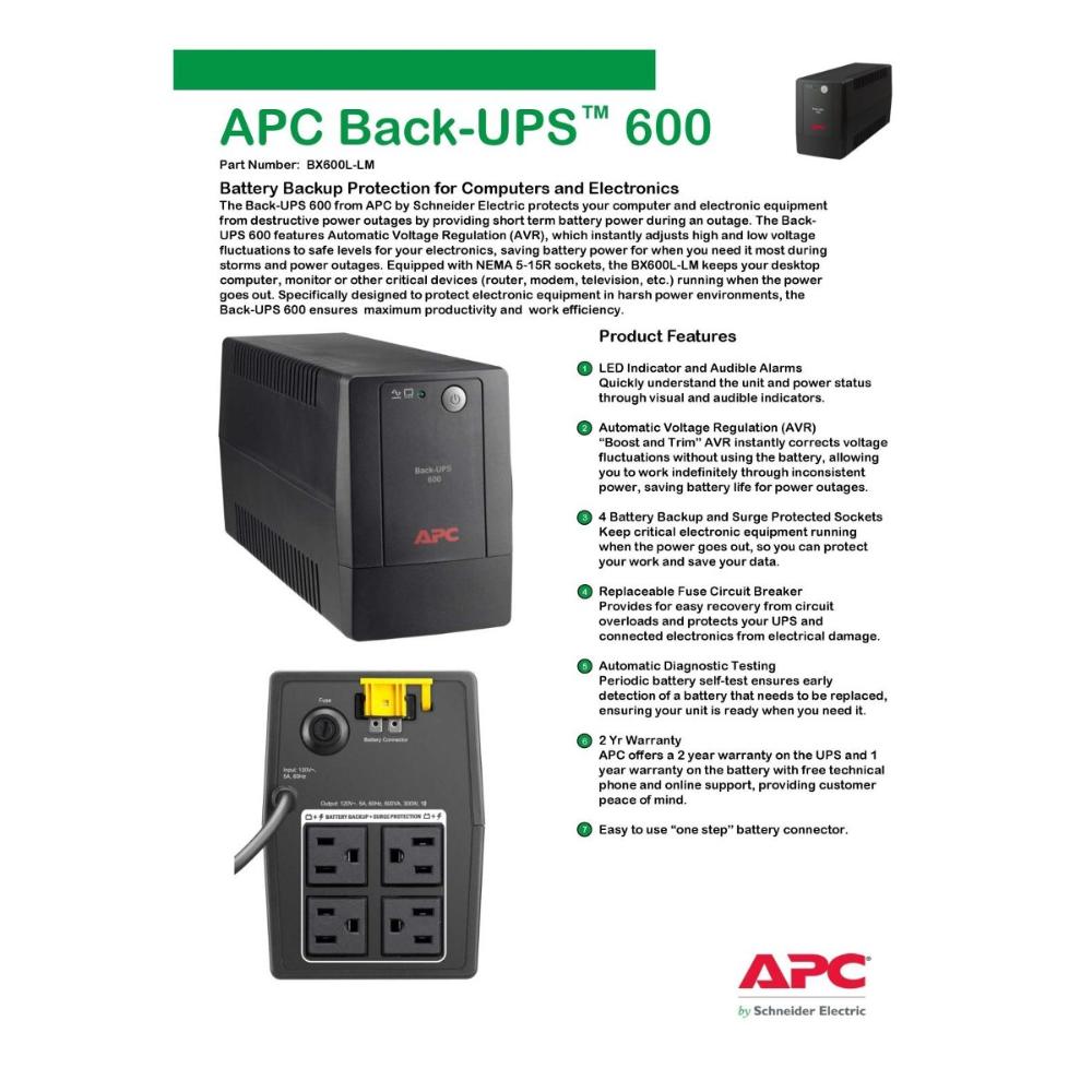 - The APC by Schneider Electric Back-UPS 600 protects your computer and electronic equipment against destructive power outages by providing short-term battery backup during a power outage. The Back-UPS 600 includes Automatic Voltage Regulation (AVR), which instantly adjusts high and low voltage fluctuations to a safe level for your equipment, saving battery power for when you need it most, during storms