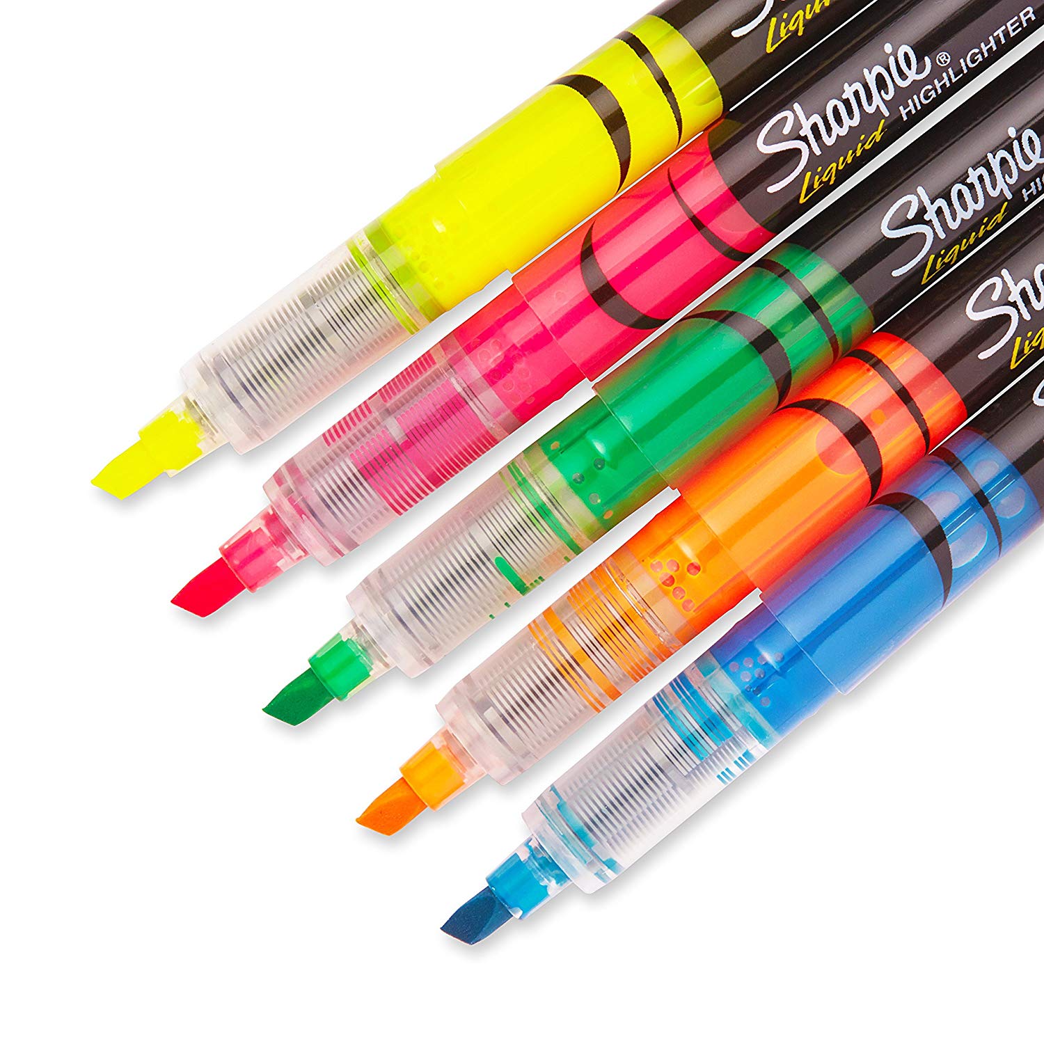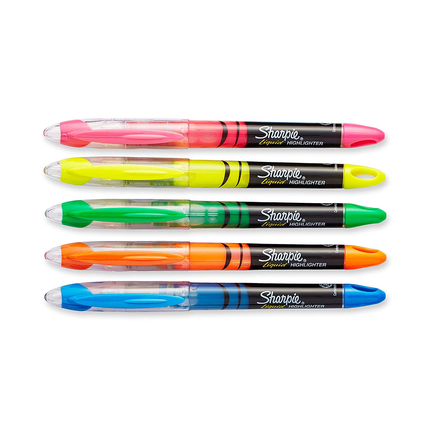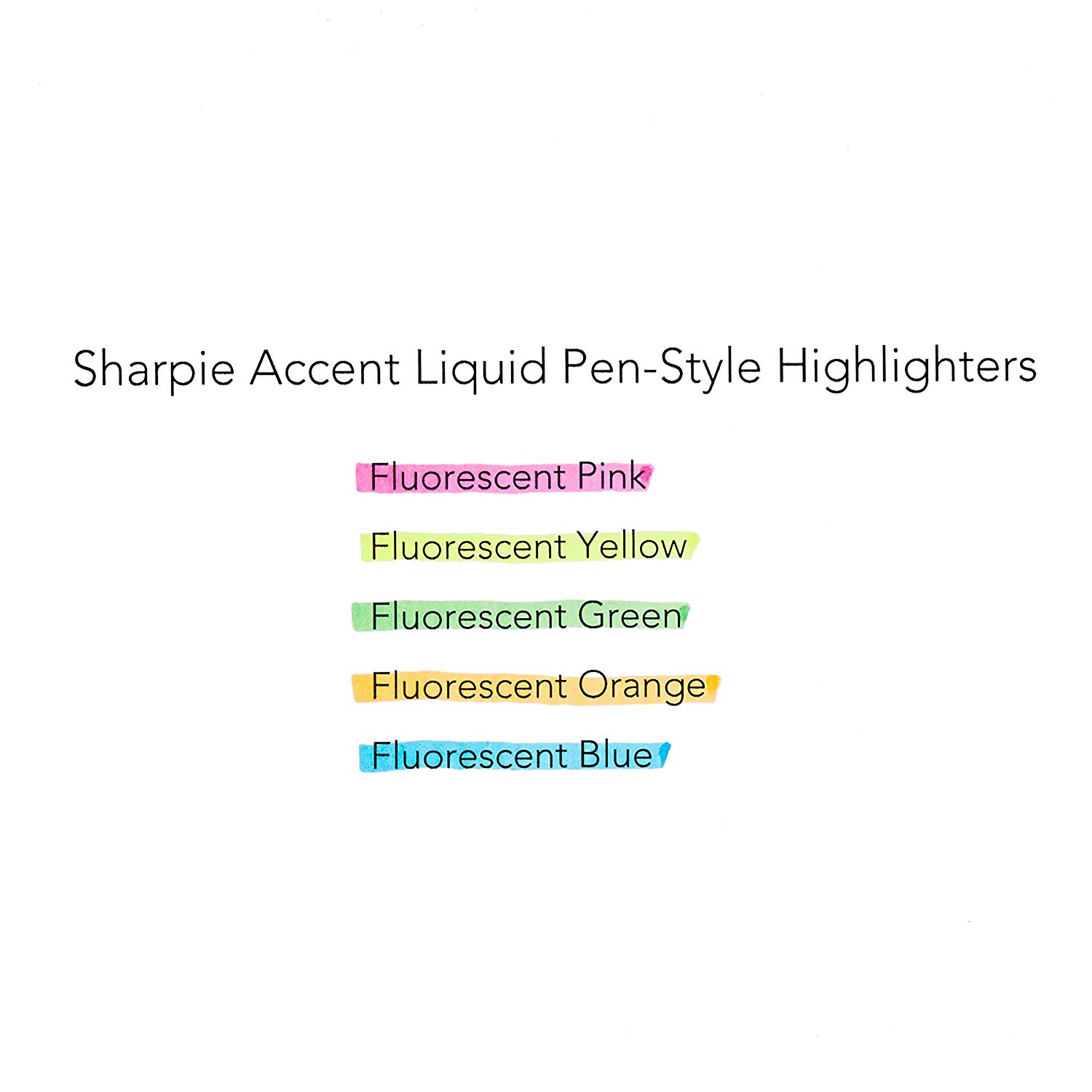 - Contains 5 highlighters, one each of yellow, green, blue, pink and orange.